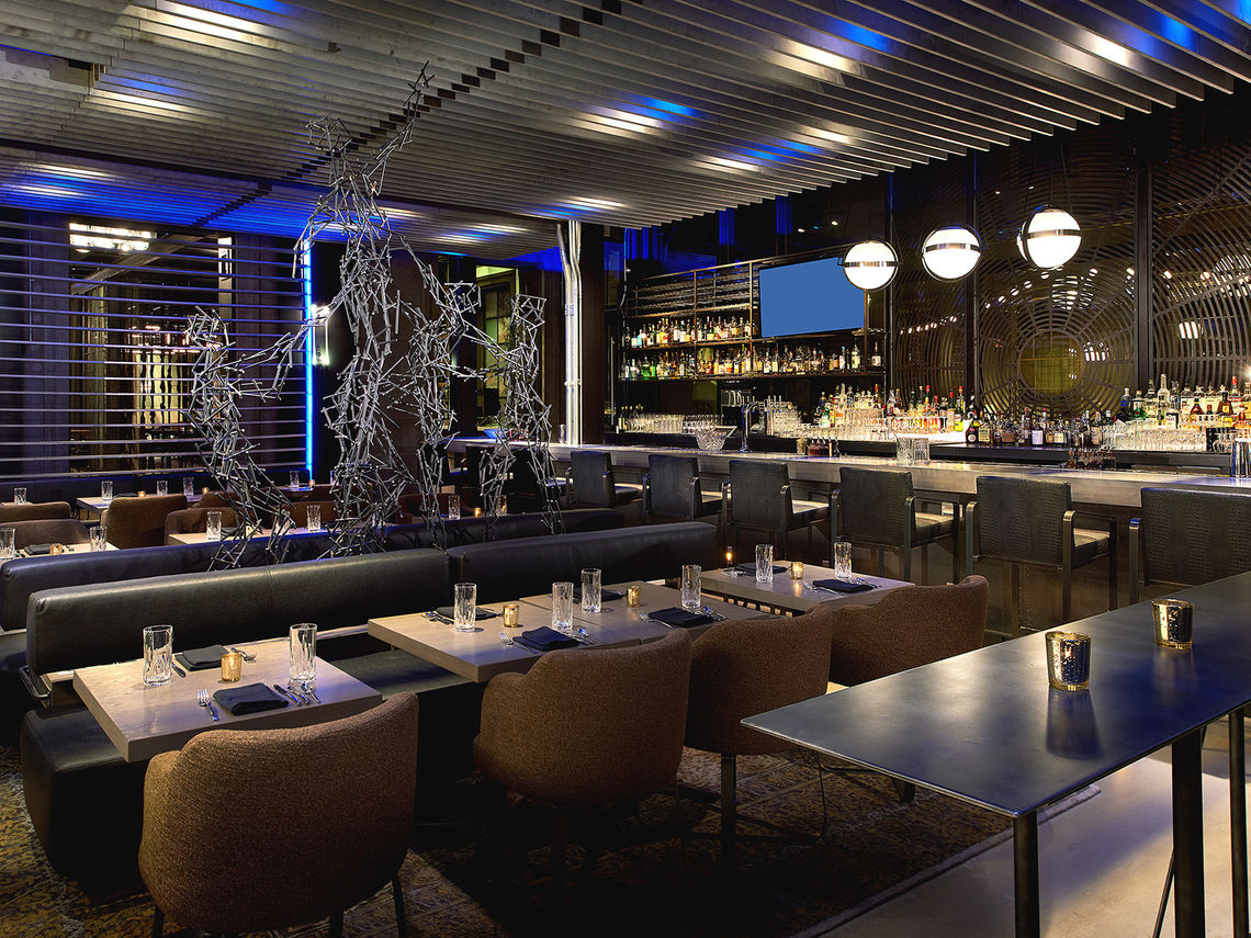 A modern architectural space with floor to ceiling windows overlooking our interior courtyard and the Kimpton Monaco Hotel. The Glass House features multiple dynamic seating areas, sculptural artwork and a full-service bar. Windows may be dimmed for an even more intimate experience. From milestone events to vibrant weddings, this unique space can adapt to your unique needs.